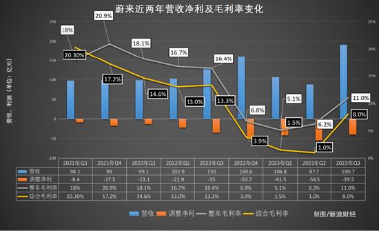 从整车毛利率来看,蔚来今年第三季度为11.0%,相比今年第二季度的6.2%有所回升,但相比2022年第三季度的16.4%,还有较大差距。