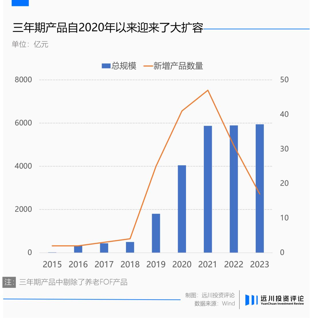 在三方共赢的畅想之下,三年期产品迎来了大扩容。相关数据显示,截至2023年12月6日,三年封闭期产品共计172只,合计规模达到了5941亿元,仅2020年和2021年就分别新增41和47只产品,占目前产品总数比重达到了51.16%。