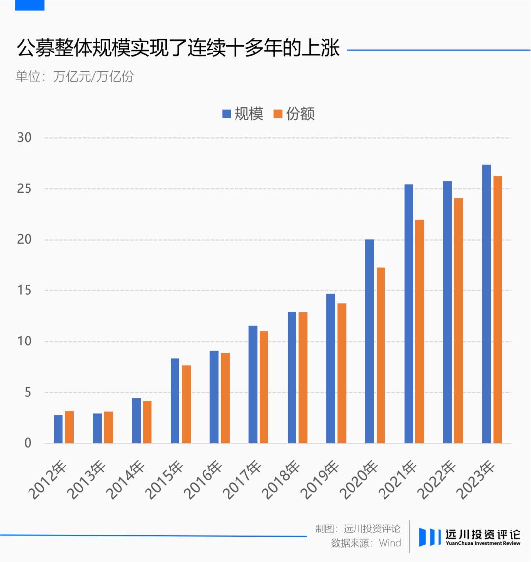 公募在过去十年当中,来回运转着这样一套生存法则。根据Wind数据,截至2023年12月4日,公募整体规模也达到了27.37万亿,相较于2022年增长了近1.62万亿,实现了连续十多年的上涨。