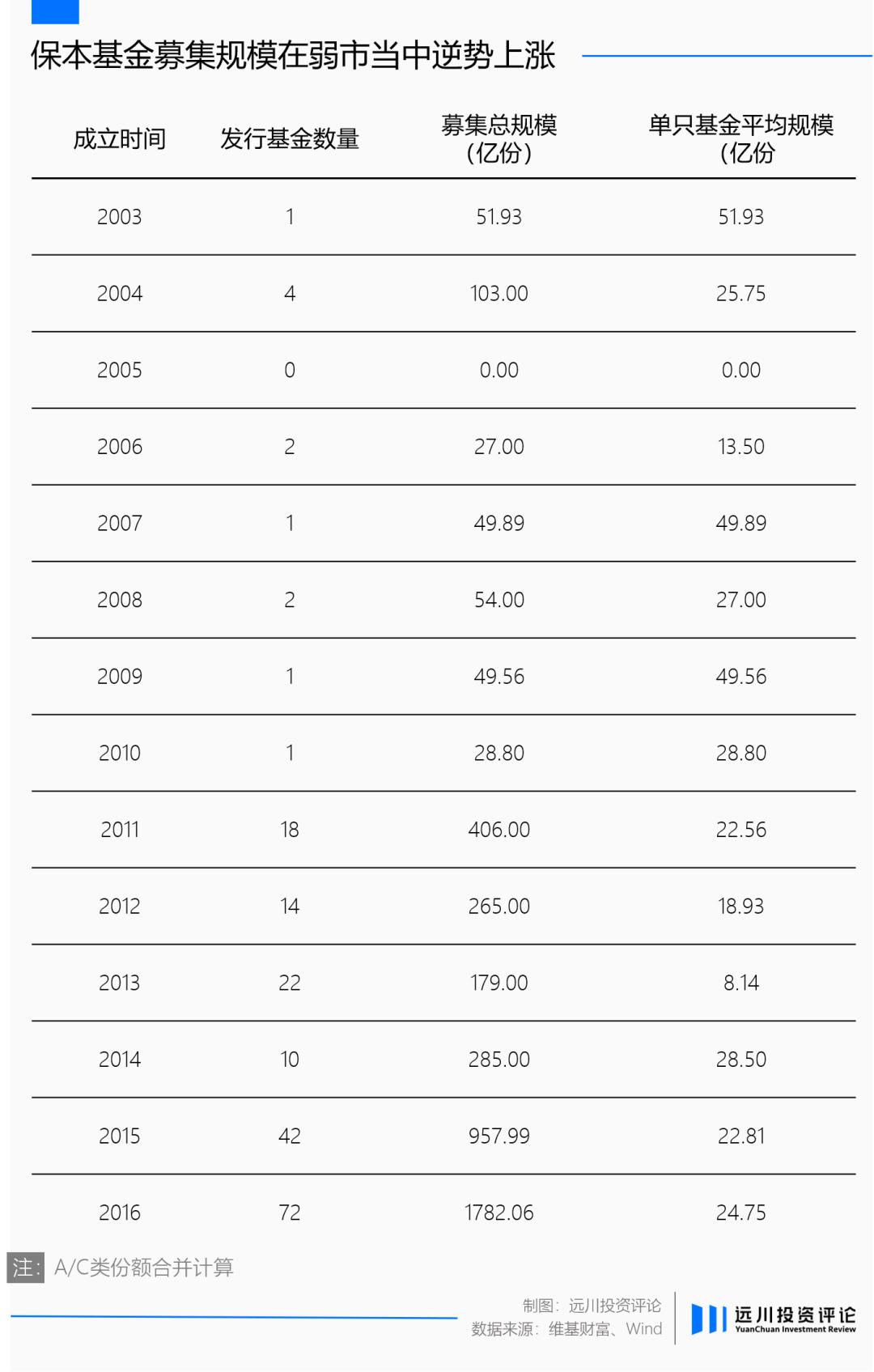而在2016年股市熔断的影响下,保本型基金进一步实现了井喷式的增长。全年共计72只产品成立,发行规模达到了1782.06亿元,仅上半年就成立了56只保本基金,合计规模为1473.43亿元,占新基金总规模的37.87%。