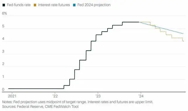 联邦基金利率目前水平、期货市场2024年利率预期和美联储2024年利率预期对比