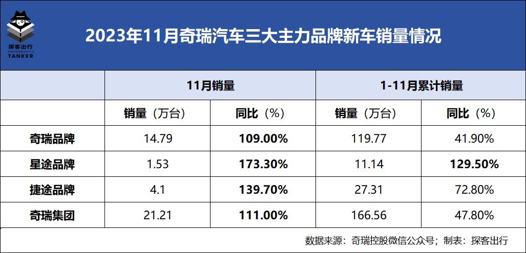 数据显示,奇瑞汽车旗下的奇瑞、星途、捷途三大主力品牌在11月的销量,均实现了同比翻倍的增长。其中,奇瑞品牌11月销量同比增长109.0%;星途品牌11月销量同比增长173.3%;捷途品牌11月销量同比增长139.7%。