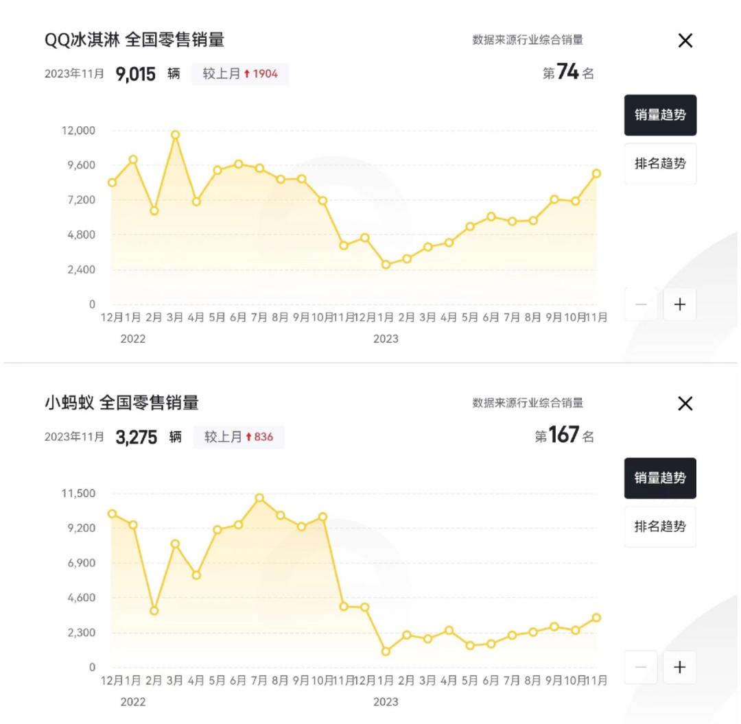 时至今日,“瑶光2025”过去了一年多时间,奇瑞的新能源产品依旧停留在QQ冰淇淋和小蚂蚁这样的代步车上,且这类新能源转型冲销量的过渡类产品在2023年的市场表现还出现了明显下滑。