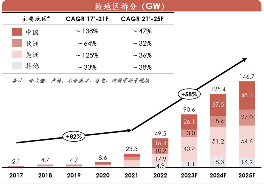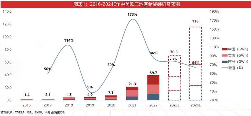 实际上,电化学储能行业依然增长不错。国内的新增装机量翻倍,美国、欧洲整体增速也在50%左右。这三个地区占全球比例达到86%,基本代表了全球行业状况。而这个增速,已经让许多行业流口水了。