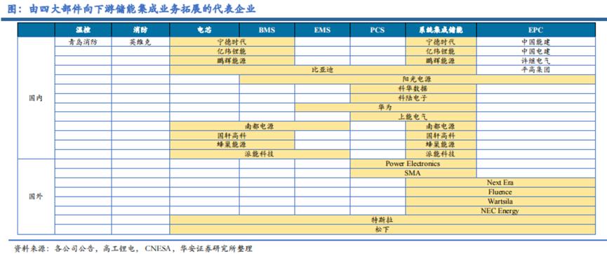 比如宁德时代、亿纬锂能等公司从电池进入系统集成;阳光电源、科陆电子、上能电气从PCS进入系统集成等。也有比亚迪这样电芯、PCS、BMS、EMS、系统集成全产业链布局的一体化。