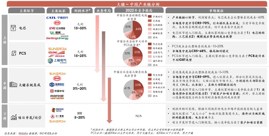 觅途咨询的调研显示,在大储系统的价值链中,上游设备制造环节是核心的利润留存点,技术壁垒高,新玩家难以进入市场;中游系统集成环节玩家众多,市场竞争激烈,核心竞争点在客户和项目资源开发能力,仅有个别头部玩家以出海业务为主;未来伴随运营市场成熟IRR提升,更多企业将向下渗透。