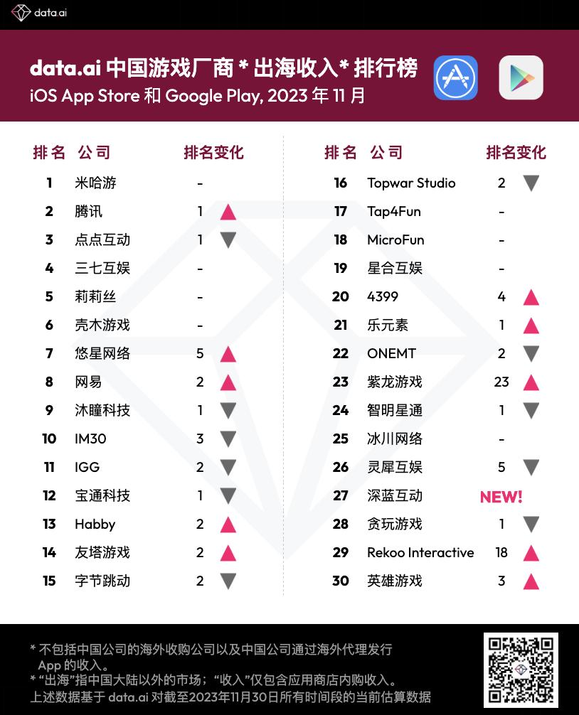 近来,深蓝互动凭借《重返未来:1999》的海外收入首次进入出海收入厂商TOP30,位列第27;游戏在12月7日更新了新版本后,在日本、韩国、港澳台市场的收入在持续走高。