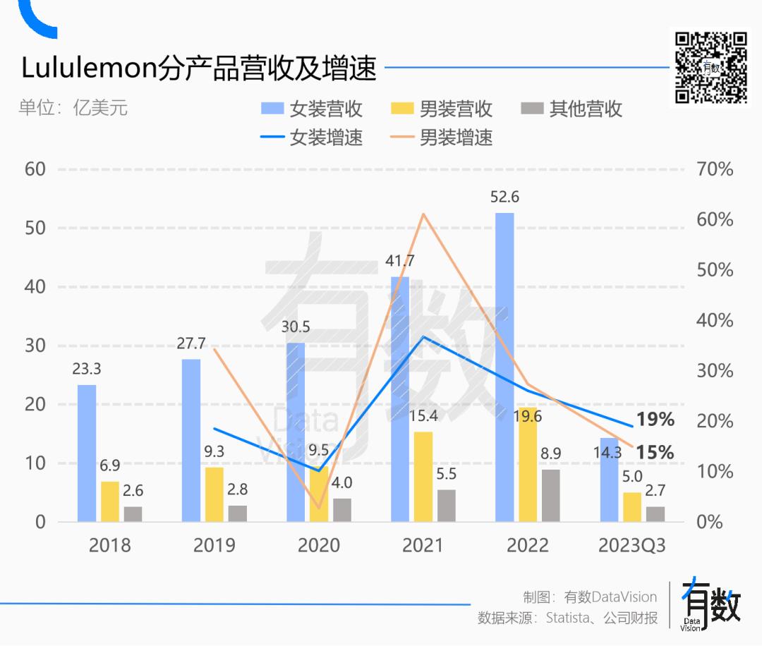 只不过,多点布局并未带来多点开花的效果。lululemon至今仍有约65%的营收还是由女装业务贡献。