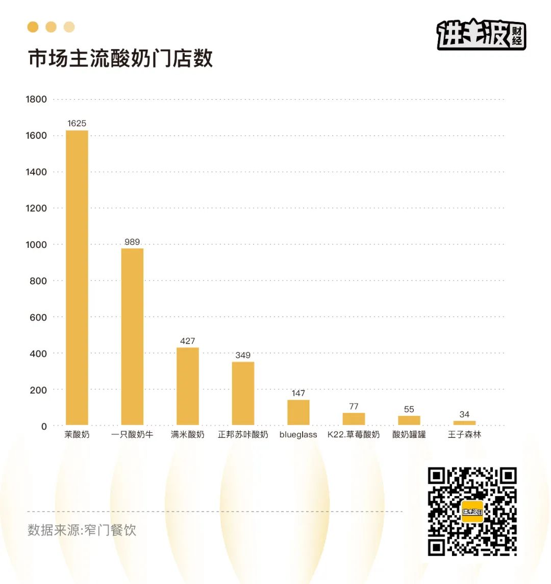 比如,成立于2014年的茉酸奶,3月17日才在公众号宣布门店数突破500家,在11月初就被君乐宝入股,如今门店数直飙1625家,翻了超三倍;成立于2018年的Blueglass,在2021年拿到超2亿元的融资,并在这近两年内拓店超147家;2020年刚成立的K22.草莓酸奶以丹东草莓为原料爆火,成为各大商场排队的“C位”;成立一年的王子森林拿到了千万级战略融资;还有酸奶罐罐、一只酸奶牛、满米酸奶、正邦苏咔酸奶等新兴品牌展露尖角。