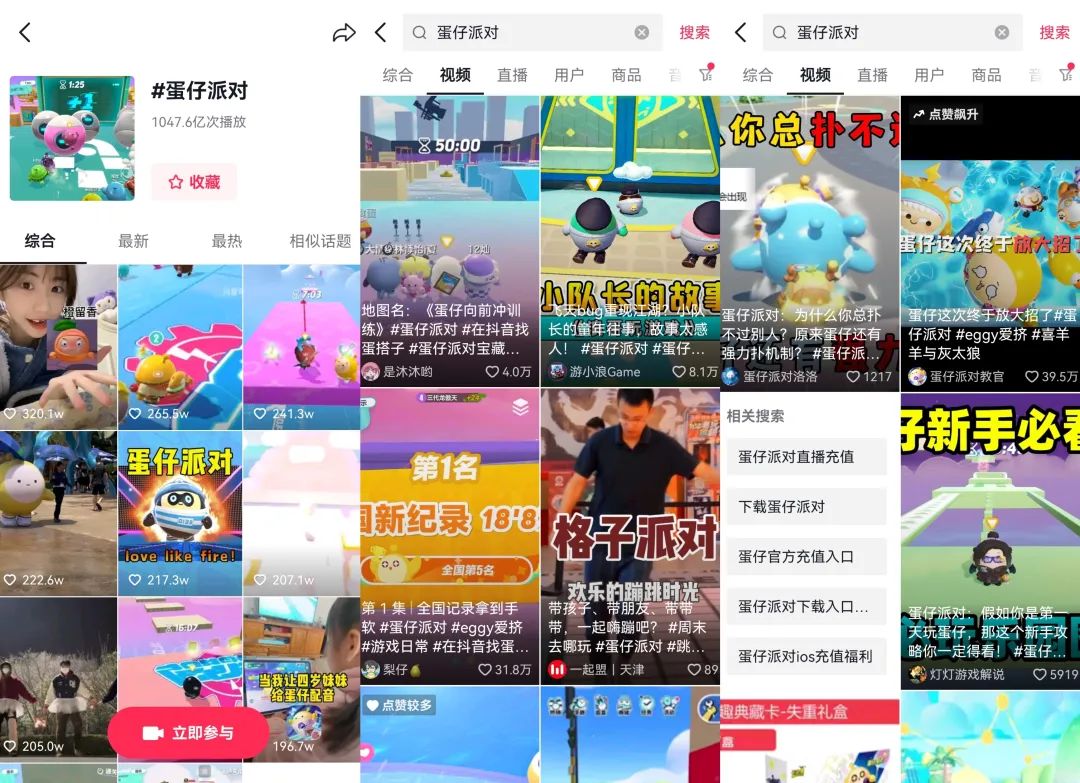 据AI蓝媒汇统计,目前抖音上#蛋仔派对 话题播放量已突破1000亿大关,主要内容以乐园小剧场、社交故事、隐藏玩法等用户二创内容为主。一些玩家也表示,自己空闲时也会效仿主播搭建地图,或者与朋友们在游戏里“演戏”。