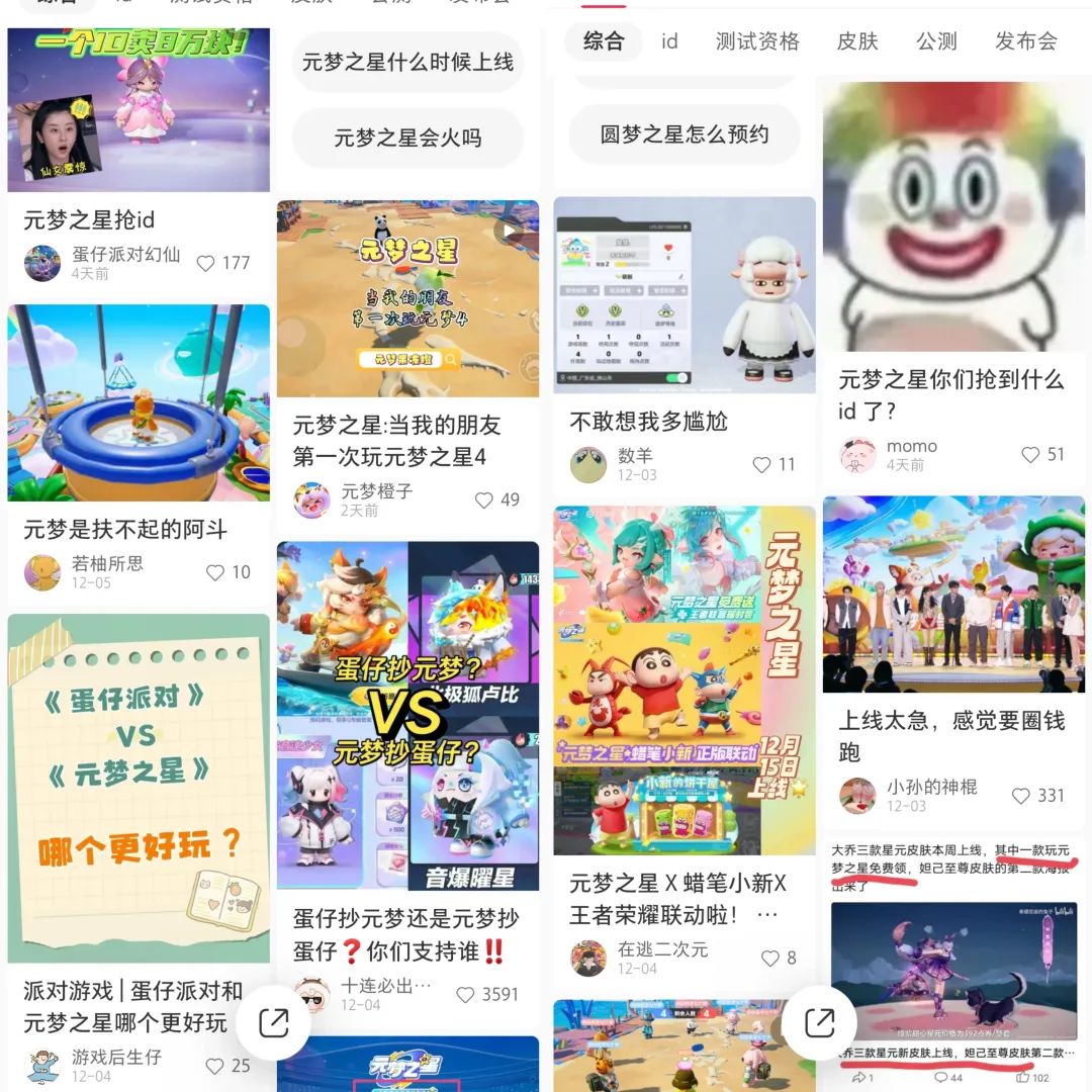 社交平台上更不必说。光是在小红书上搜索“元梦之星”,就能看到不少博主顶着“元梦之星”的id发布内测的游戏画面。一些人在每天更新提醒《元梦之星》上线的倒计时、提醒用户抢注UID,也有一些人则带着质疑开扒《元梦之星》与《蛋仔派对》皮肤、地图、技能之间的相似点,又在另一群人的维护下闭麦。