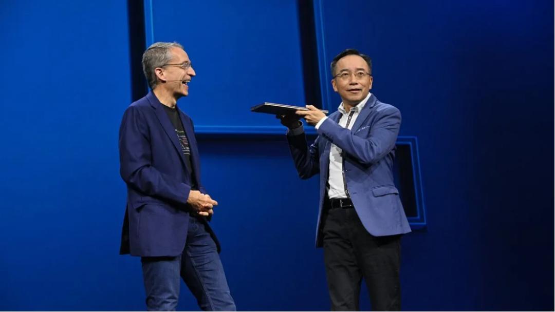 英特尔执行长Pat Gelsinger(左)和宏碁首席营运长高树国共同展示AI PC