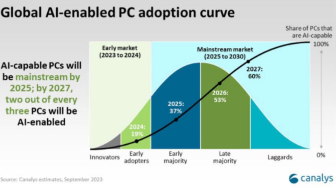 由于PC已经有成熟的消费市场,AI PC已接近产业落地的转折点。支持人工智能的PC市场有望在2025年和2026年大幅扩张。根据Canalys预测,到2027年60%的PC将具备人工智能功能。