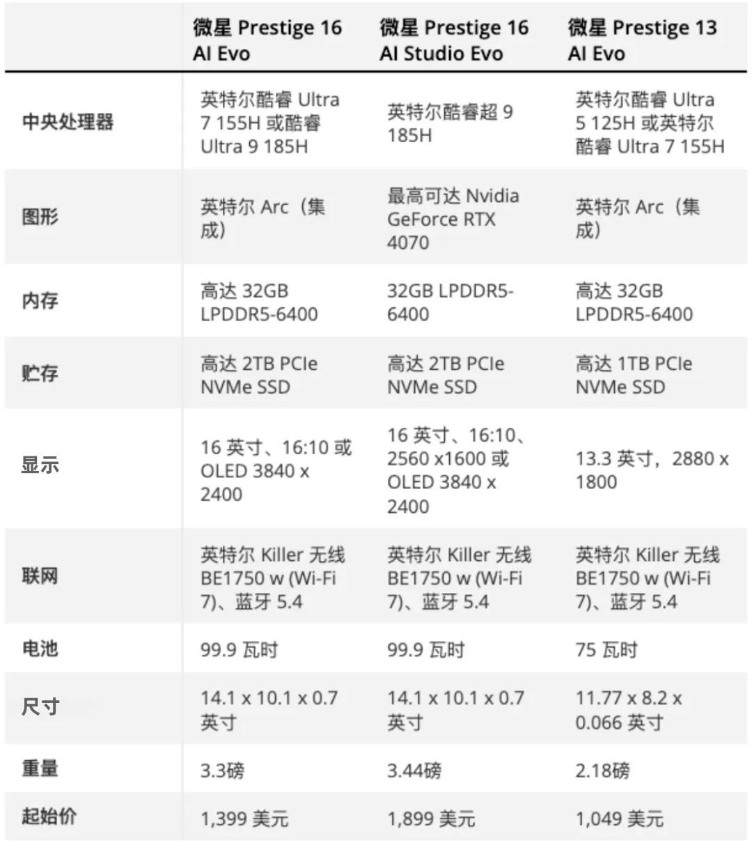 微星推出了Prestige 16 AI Evo、Prestige 16 AI Studio Evo 和 Prestige 13 AI Evo三款笔记本电脑,都搭载新的酷睿Ultra 7 H处理器。这三款笔记本的价格分别为1,399 美元 、1,899 美元和1,049 美元。