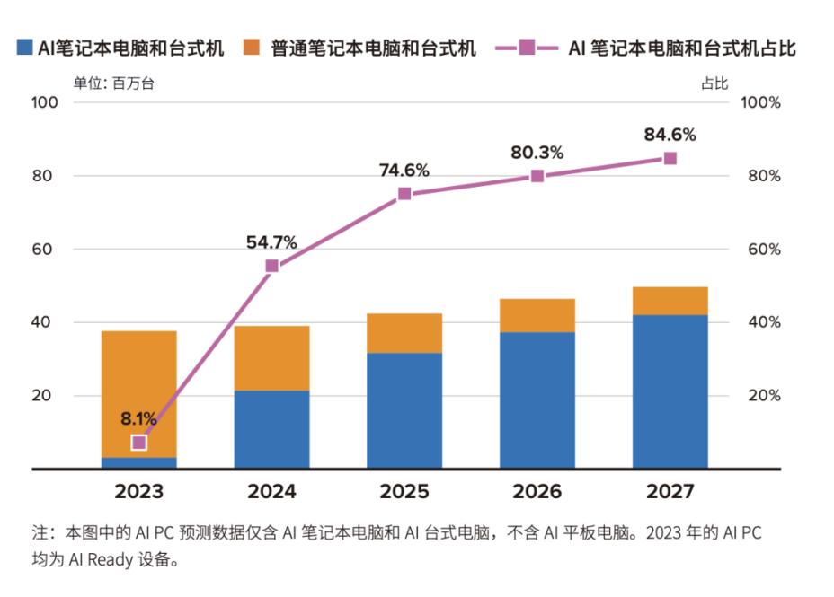 IDC最近发布了对与AI PC的数据预测,认为AI PC在中国PC市场中新机的装配比例将在未来几年中快速攀升,将于2027年达到85%,成为PC市场主流。