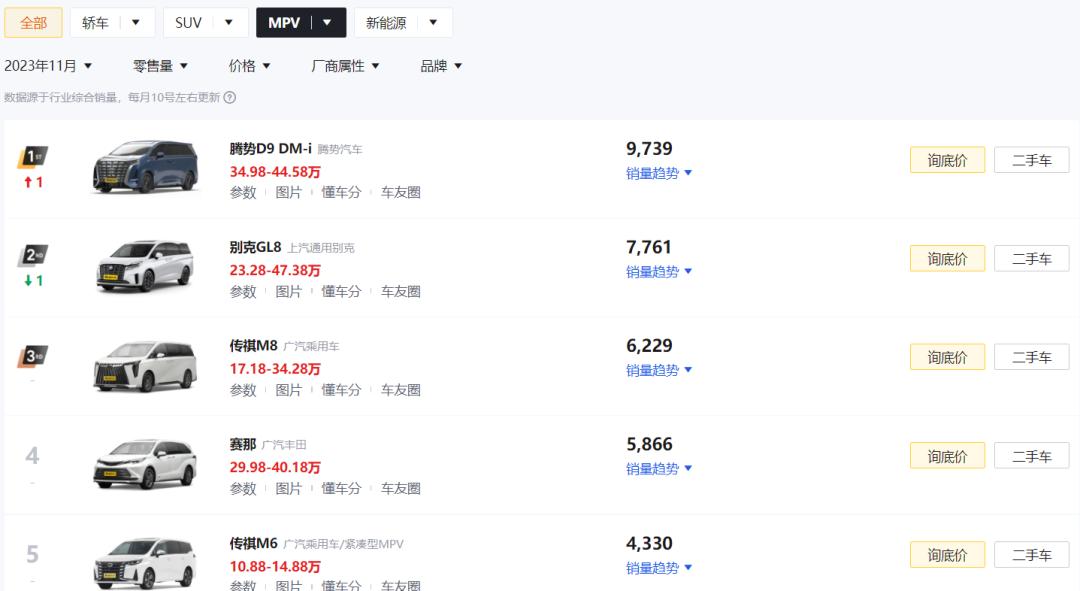 正因如此,MPV车型售价普遍高昂,今年11月国内MPV销量排行前五的车型,除了传祺M6价格较为便宜,其他四款车型售价均在20万元以上。甚至说统计前销量排行前二十名,绝大多数汽车的价格也在20万元以上。