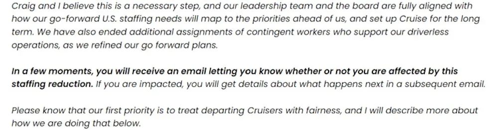 而在外籍员工支持方面,对于签证持有人,Cruise将在3月24日之前继续发放工资,以代替一次性遣散费,以帮助离职员工有更多的时间来帮助过渡和管理他们的移民身份。