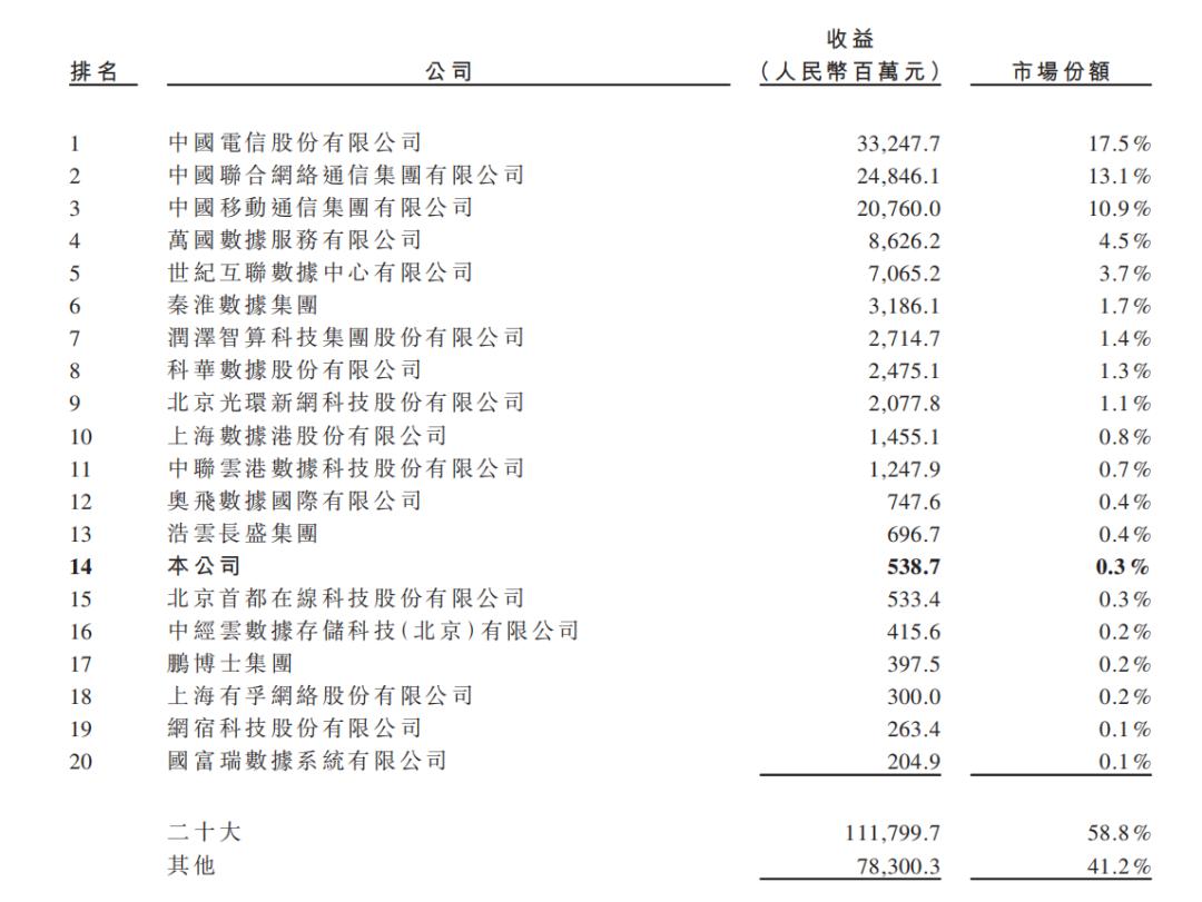 弗若斯特沙利文数据显示,截止2022年底,国内有超过400家IDC数据服务提供商。若按收入计算,2022年云工场科技以5.39亿元收入排名行业第14,市场份额仅为0.3%。