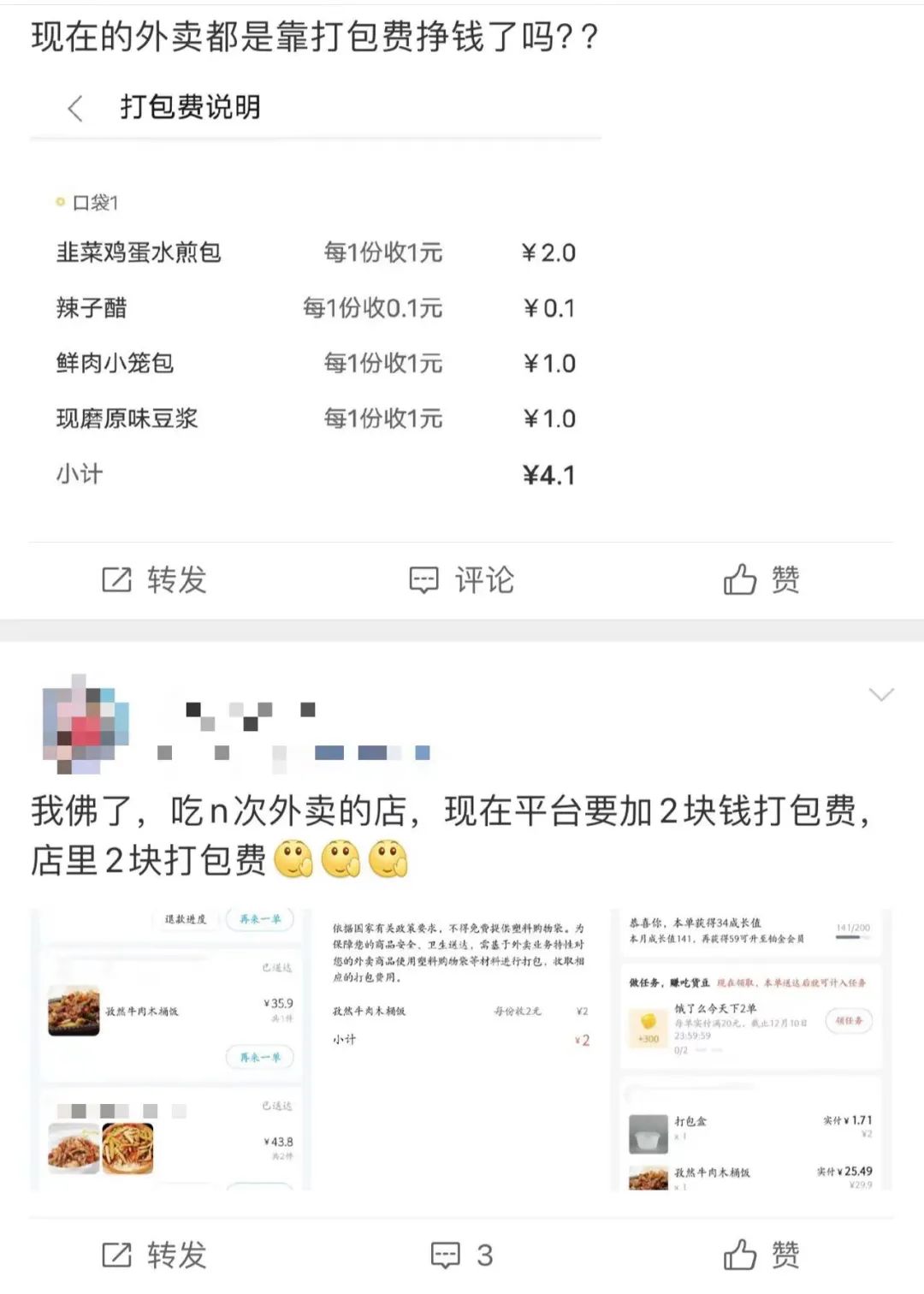▲网友吐槽外卖打包费问题 来源:社交媒体截图
