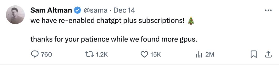 美国时间12月14日,OpenAI创始人Sam Altman发帖表示,因为我们拿到了更多GPUs,OpenAI现在重新开放ChatGPT Plus付费订阅服务的新用户注册!