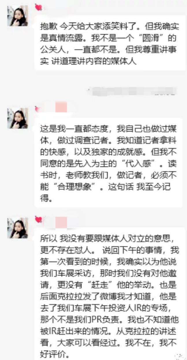 随后,小鹏公关总监徐静或许意识到自己的言行失当,公开回应称“自己不是一个‘圆滑’的公关人,一直都不是,但我尊重讲事实讲道理讲内容的媒体人。”徐静表示,自己没有要跟媒体人对立的意思,更不存在怼人。当时媒体是去了车展下午投资人IR的专场,那个不是PR负责,也不知道他被IR赶出来的情况。但针对徐静的这个表态,有媒体评论称“这个回复,或没有起到消除双方对立的作用。”