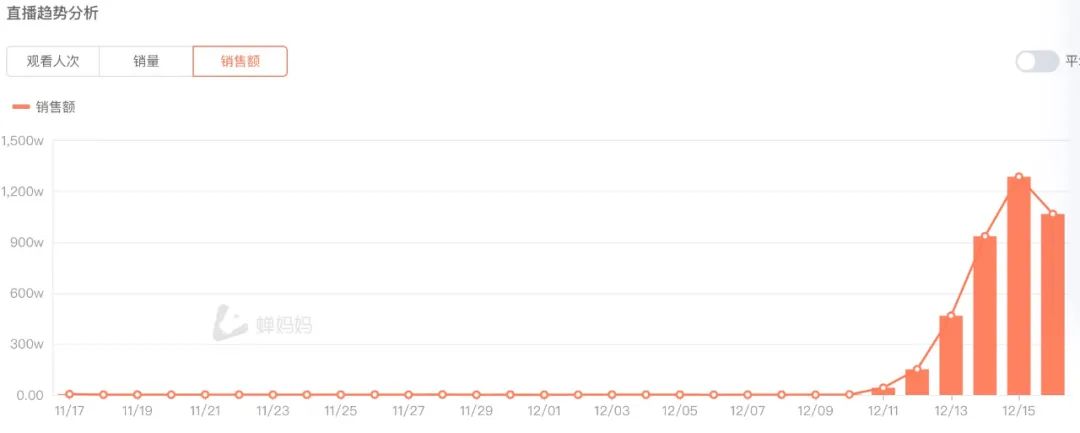 据蝉妈妈数据,12月高途佳品总计涨粉超过100万,直播间在线人数最高达到18万,直播日观看人次从原本的寥寥无几,到12月16日超过2000万人次,直播日销售额也在15日冲上了1200万元。