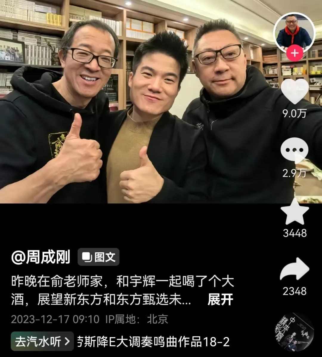 12月16日晚,俞敏洪和董宇辉双双现身俞敏洪“老俞闲话”直播间,坦诚回应风波。董宇辉表态不会离职,俞敏洪也解释了孙东旭被免职CEO后将依然“为东方甄选做贡献”。17日早上,新东方教育科技集团CEO周成刚发文称“昨晚在俞老师家,和宇辉一起喝了个大酒,展望新东方和东方甄选未来的发展,两个老头,一个年轻人”,并配上三人在俞敏洪家“喝大酒”的照片。事件终于尘埃落定。