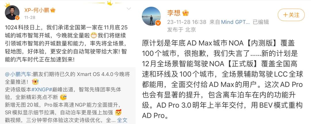 十一月底,理想汽车创始人李想在微博反向道歉,表示原计划城市NOA[1]内测版年度覆盖100个城市,但是我们食言了,因为我们不仅提前完成了布局,而且推出的还是正式版。之后,小鹏汽车创始人何小鹏也迅速跟进,表示自家也提前完成了落地25城的目标。(两者的落地标准有区别,小鹏汽车的目标是无高精地图城市,理想聚焦高速、换线、城市快速路等场景,我们统称城市辅助驾驶)