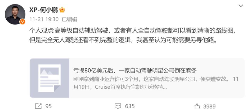 就如同何小鹏在评价Cruise雪崩时在微博提到的那句话一样:高阶自动辅助驾驶或有人全自动驾驶都可以看到清晰的路线图,但“完全无人驾驶看不到完整的逻辑,我甚至认为可能需要另寻他路”。