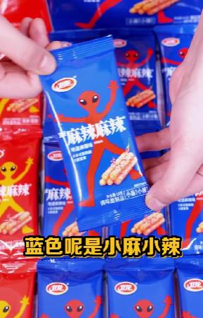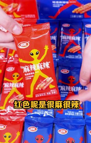 麻辣麻辣大单品的第一“式”是产品本身的新形象和CP感。卫龙抛开了此前“辣条”变大变小的“新瓶老酒”,而是在面制调味品的实力基础上,“真刀实枪”的推了一回大单品。无论是两款“麻辣麻辣”红蓝CP的主色调设计,还是商品包装袋上独一无二的“看上去不是太正常的外星人”形象,卫龙在单品本身“爆款因素”上增加了“形象出圈度”。