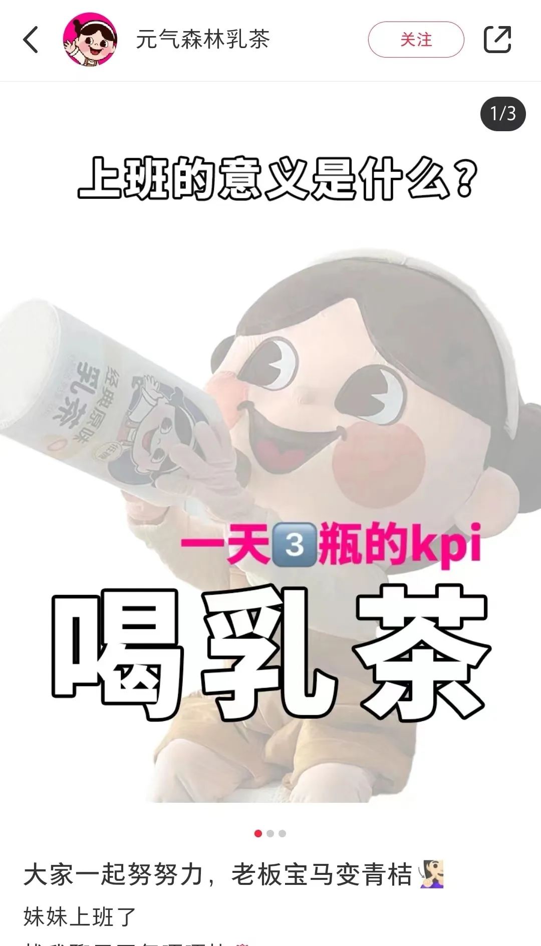 2023年开始,元气森林逐渐将其作为“苦命”打工人的“专用茶”,在各大社区平台连带场景化一同绑定为乳茶的营销,其小红书官方账号发布的多条笔记也将乳茶的场景同“公司”、“打工”的标签相关,进一步强调产品特性并抢占场景心智。而后,元气森林邀请“田曦薇”成为其乳茶品牌大使,加持乳茶“元气满满”的产品形象,增加用户好感度。虽然开头不顺,但在元气森林孜孜不倦的营销布局下,乳茶这一单品终于有了起色。