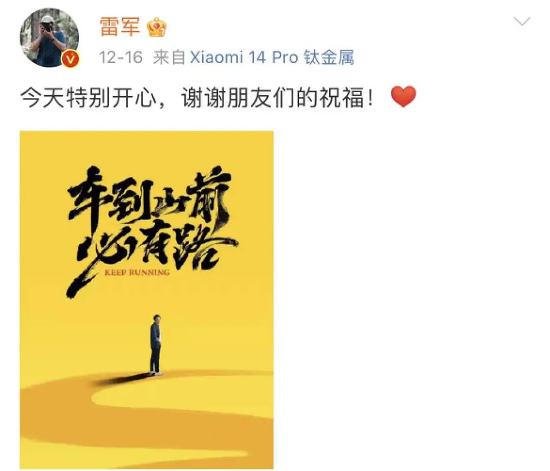 在这条微博里,雷军附带了一张海报,海报上的文字“车到山前必有路”又引发了人们的解读。不少业内人士认为,或是在暗示小米汽车即将发布。
