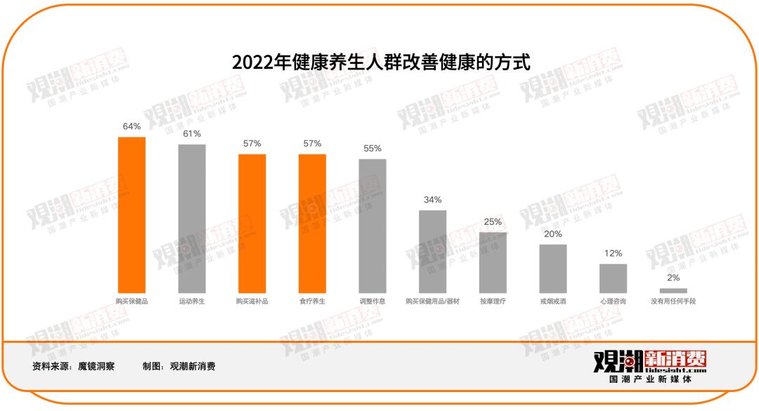 食疗滋补是年轻人最愿意选择的养生方式。根据《2023药食同源保健品滋补品行业分析报告》,在2022年健康养生人群改善健康的方式中,64%的人愿意购买保健品,57%的人愿意购买滋补品,57%的人选择食疗养生。