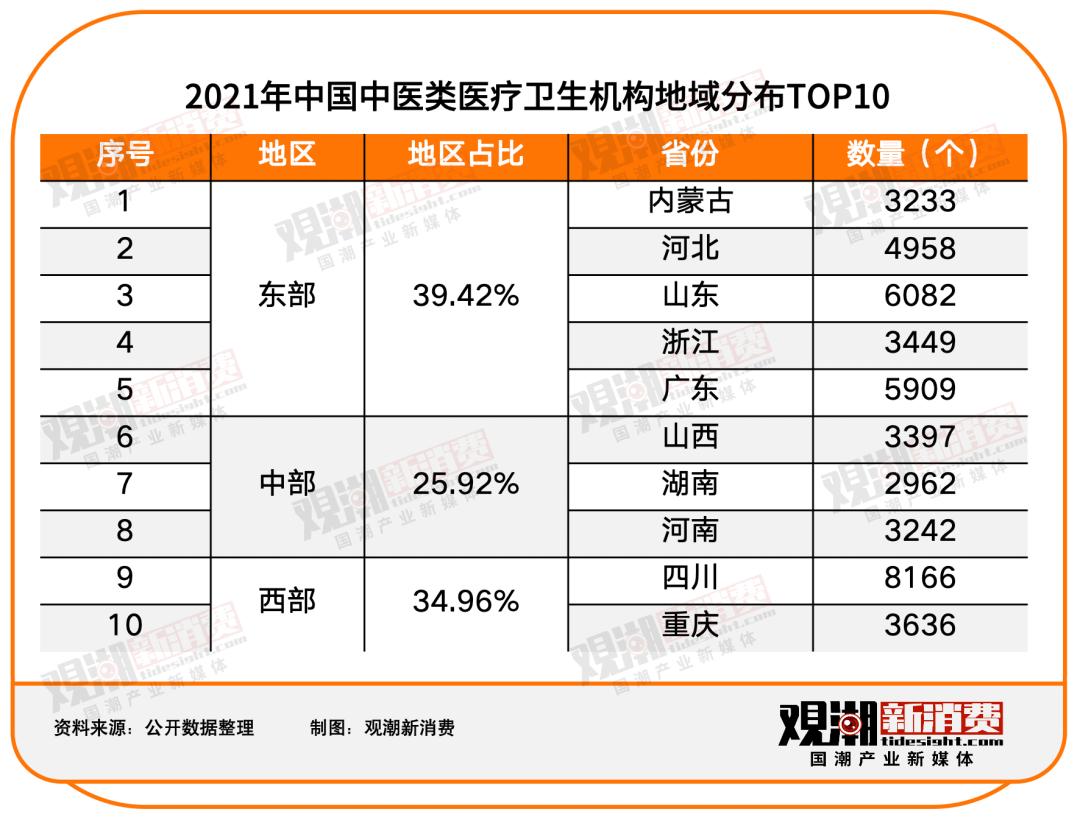 根据灼鼎咨询数据公布的2021年中医机构地域分布TOP10,中医类医疗卫生机构数量最多的省份是四川,为8166家,远超其他省份,其次为山东、广东等省份。