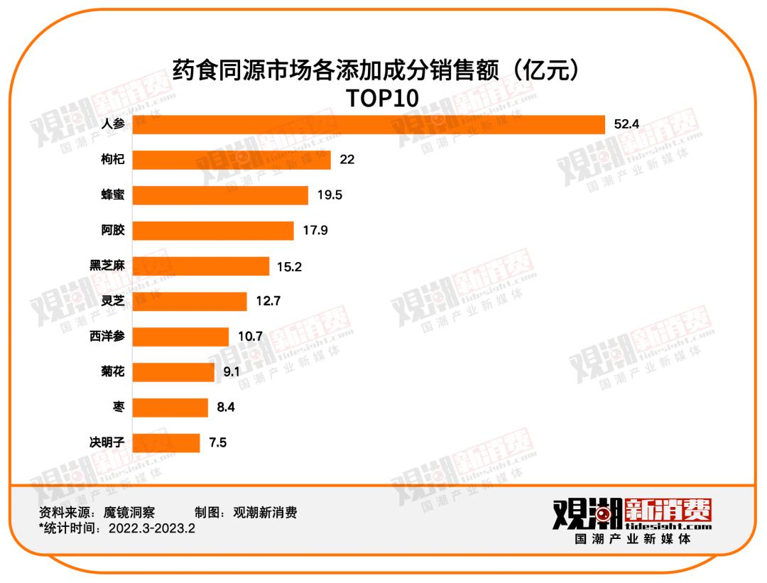 除了线下的咖啡茶饮,药食同源相关产品在线上平台也刮起了一阵潮流风。根据魔镜洞察数据,淘宝天猫药食同源市场2022年3月至2023年2月期间销售额近230.8亿元,市场规模同比增长1.9%。在药食同源各添加成分中,人参、枸杞、蜂蜜的销售情况最佳,紧随其后的是阿胶、黑芝麻等近几年愈发受到关注的材料。