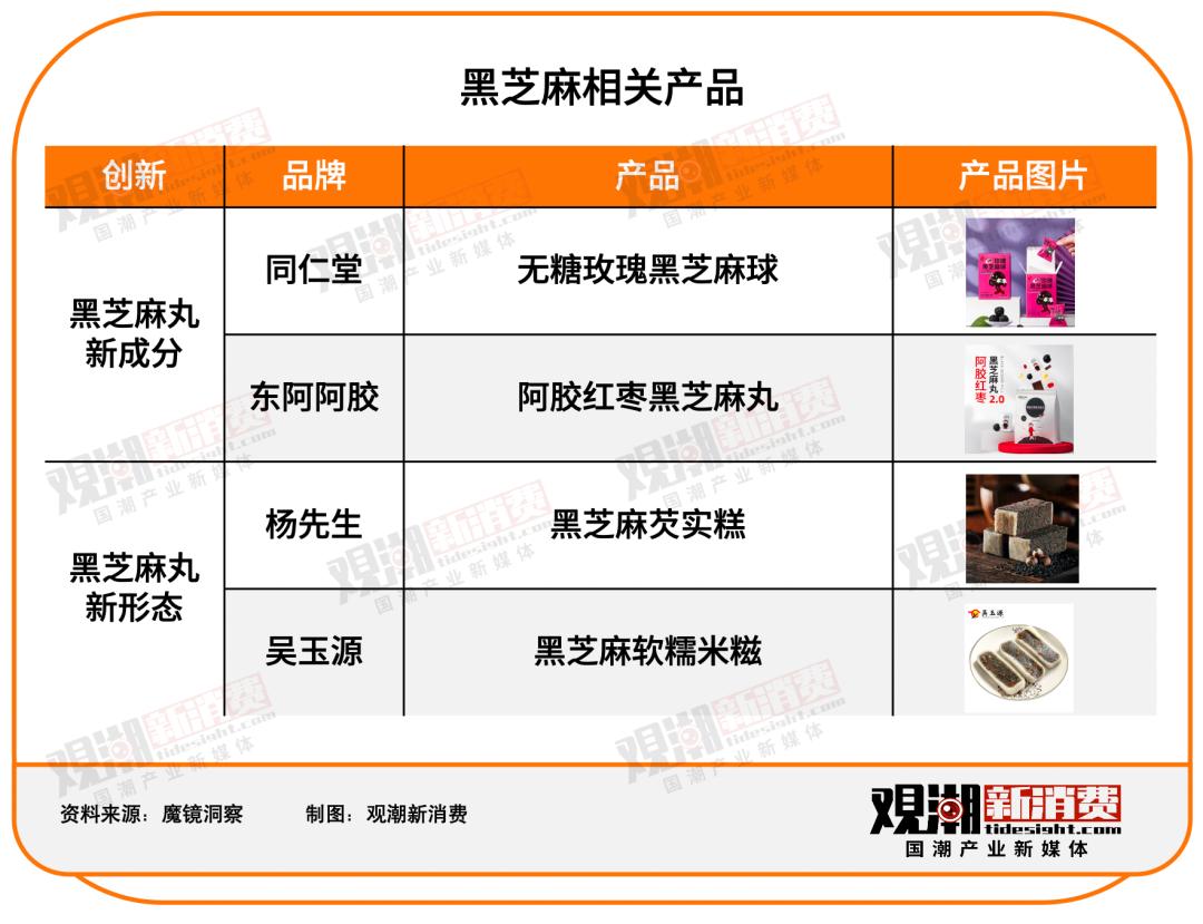 以黑芝麻为例。黑芝麻相关产品在众多健康养生产品成分中已经发展得较为成熟。诞生于1912年的老金磨方于2008年进入电商领域,并将黑芝麻丸成功带进年轻人的视线。2019至2021年,老金磨方的天猫黑芝麻丸连续三年销量领先,全网累计热销超2亿颗。在黑芝麻丸逐渐火热之际,2021年传统黑芝麻丸产品直播矩阵调整,随之而来的便是成熟市场中的产品细分。至此,新老品牌纷纷入局,将传统黑芝麻丸改良创新,甚至推出黑芝麻成分的新形态产品。