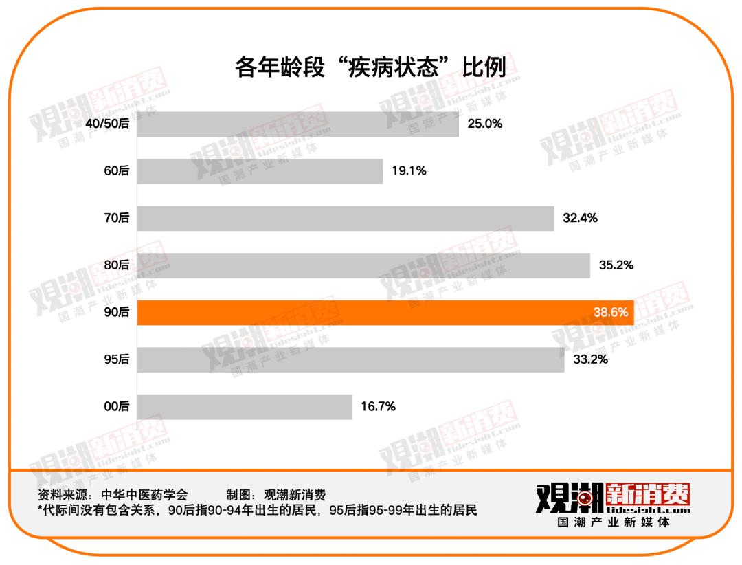 高强度的压力之下,长时间的情绪压力和错误的生活习惯,让很多年轻人的身体都有点“小毛病”,腰酸背疼、肠胃不适、睡眠不稳等不一而足。根据中华中医药学会数据,90后居民疾病状态的比例约为38.6%,在各年龄段中占比最高;其次是80后和95后。