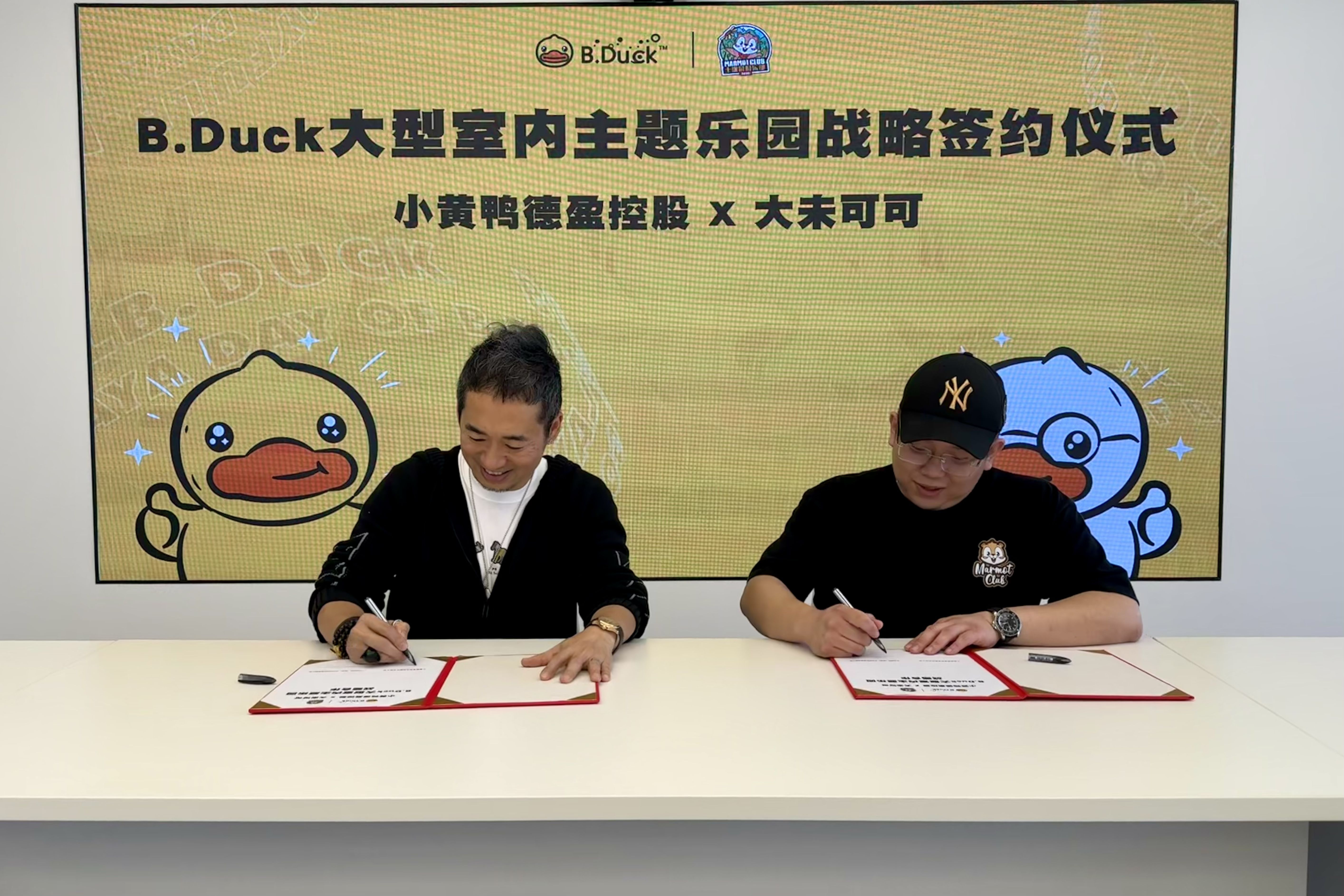 小黄鸭德盈作为国内原创头部 IP 综合运营企业,除核心B. Duck”小黄鸭外,旗下还拥有26个原创角色及4个国际品牌代理,全网粉丝数量超过 2000万人,家族角色元素相关的各类内容合共有超过10亿次观看次数。大未可可(GREATCOCO)是国内头部室内实景娱乐品牌方和供应商,旗下拥有超级土拨鼠俱乐部、土拨鼠俱乐部等五大核心品牌,与众多国内一线IP有着深度的开发落地合作。本次“B. Duck大型室内主题乐园及城市文商旅”的合作,双方将以B.Duck的IP为核心,以打造城市文商旅新地标为目标,共同建设20000-30000m²的大型室内主题乐园,以“原创IP+实景娱乐+沉浸式体验”的游玩模式,开发B.Duck主题乐园+主题街区+主题酒店的城市文商旅新业态。
