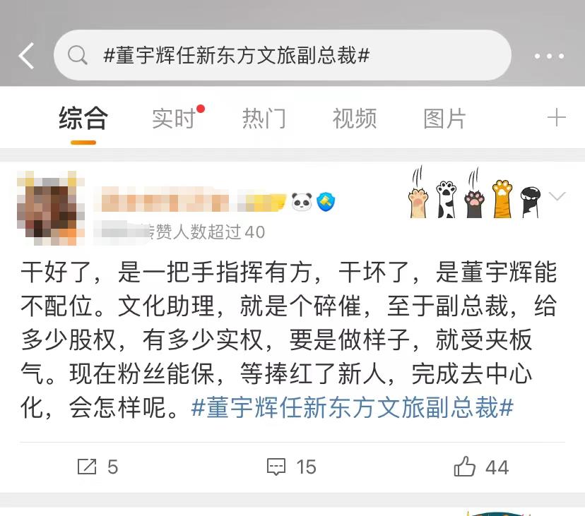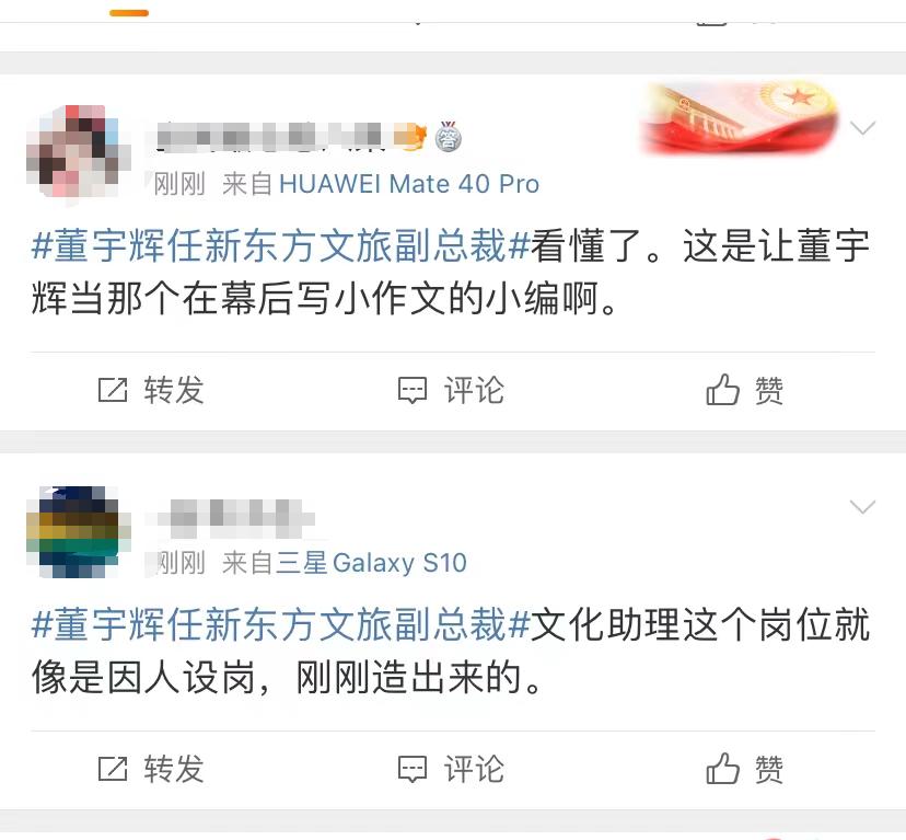 在消息发布后,#董宇辉任新东方文旅副总裁#话题一跃成为微博热搜榜首位,每条消息下面都跟着董宇辉“丈母娘”和“吃瓜路人”的热心评论,有人认为能做出这样的决定,是俞敏洪足够大气有格局,给到董宇辉东方甄选之外更高的展示舞台;也有观点认为,董事长文化助理和文旅集团副总裁都是非核心职位,明升暗降是让董宇辉做个“吉祥物”。