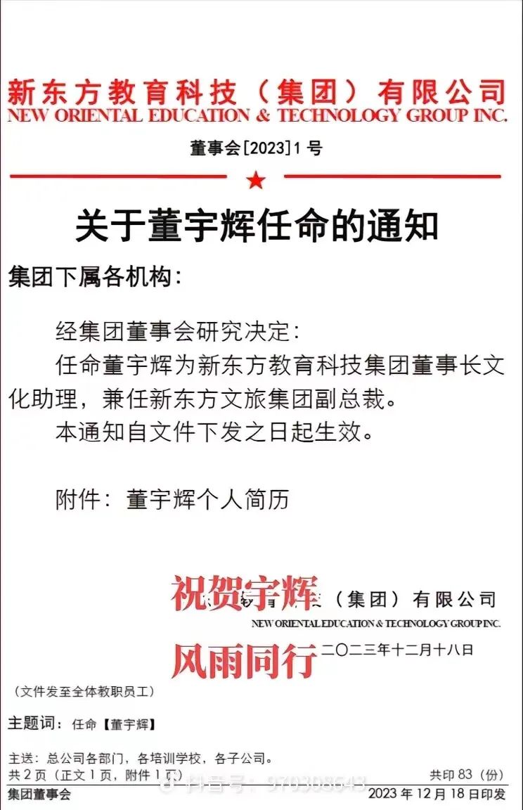 12月18日,俞敏洪在其个人社交平台发布最新任命消息,宣布董宇辉升任为新东方教育科技集团董事长文化助理,兼任新东方文旅集团副总裁。