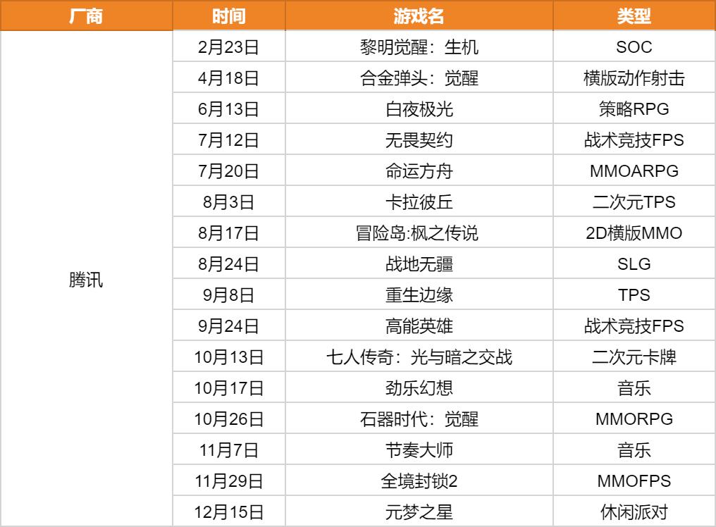 腾讯游戏在今年一共拿出了16款新品,是大厂中上新数量最多的厂商。16款游戏中,11款为移动游戏,客户端游戏则有5款。而从游戏类型来看,以射击为主要玩法的产品达到7款,而MMORPG类型亦有3款,此二者仍是腾讯不断加码的强势领域。