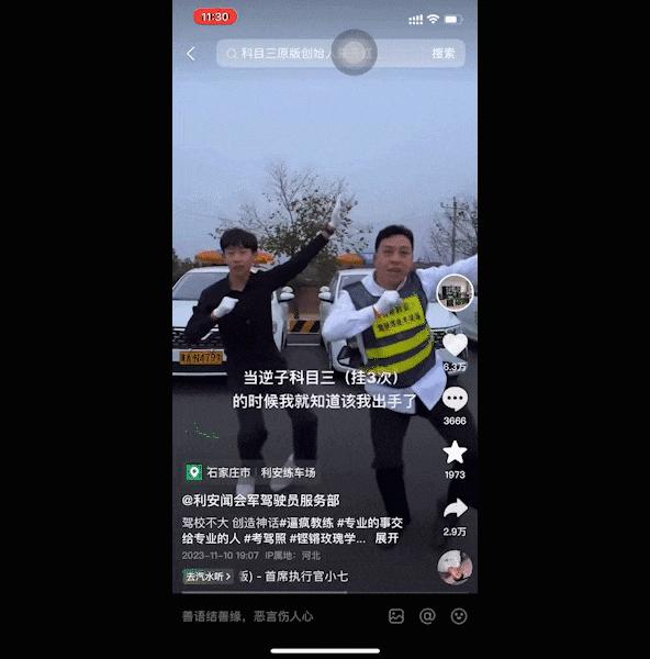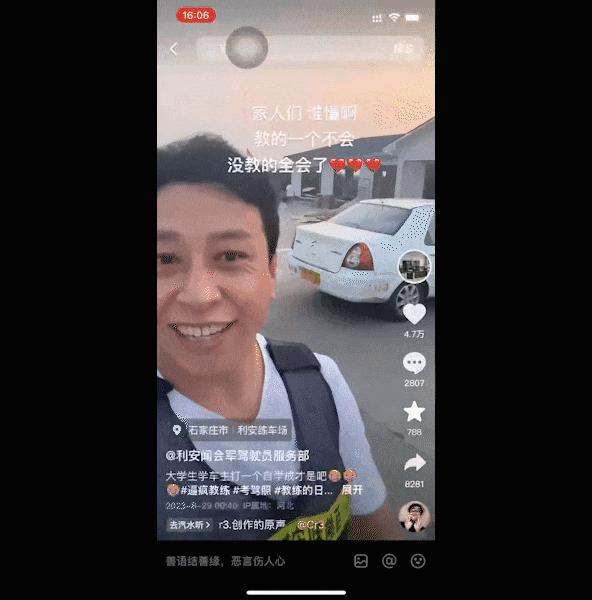 上班的时候,他是 “ 利安闻 ” 账号里的驾校教练,不定期发一些在驾校带学员的日常玩儿梗视频: