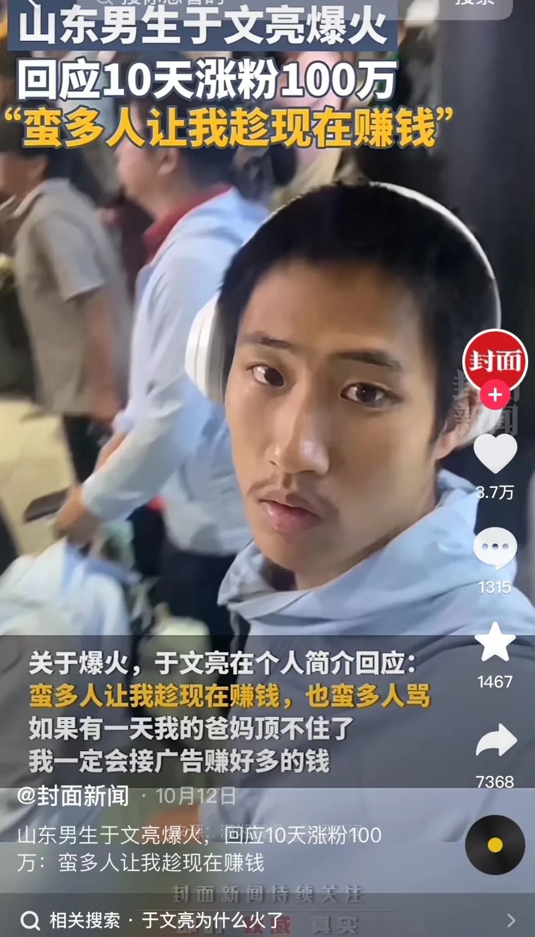 例如,最近的,今年 10 月份爆火的素人网红 “ 于文亮 ”。