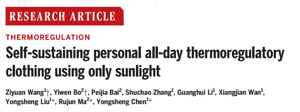 相关研究论文以“Self-sustaining personal all-day thermoregulatory clothing using only sunlight”为题,已发表到 Science 上。