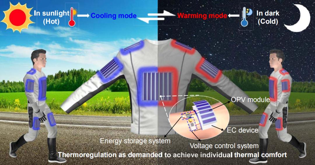 近日,南开大学的研究团队研发了一种可以全天太阳能供电的双向温度调节服装系统,该系统通过快速热调节可以将热舒适区从 22°C 至 28°C 扩展到 12.5°C 至 37.6°C,且具有快速的体温调节速率,从而确保在各种复杂和不稳定环境中人体的安全和舒适。