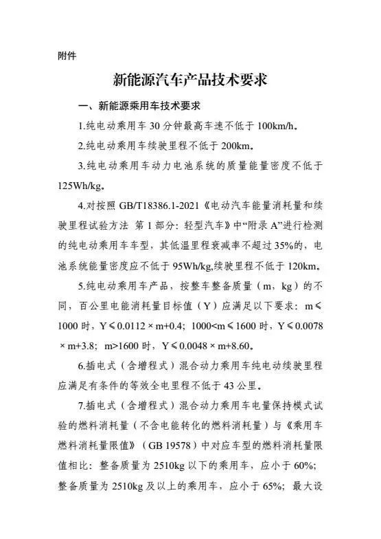 具体来看,《公告》对新能源车的技术要求主进行了三方面的调整,其中最主要的一点是,提高了整车能耗、续驶里程、动力电池系统能量密度等现有技术指标要求:纯电动车30分钟最高车速不低于100km/h;纯电动行驶里程不低于200km;电池包能量密度不低于125Wh/kg。