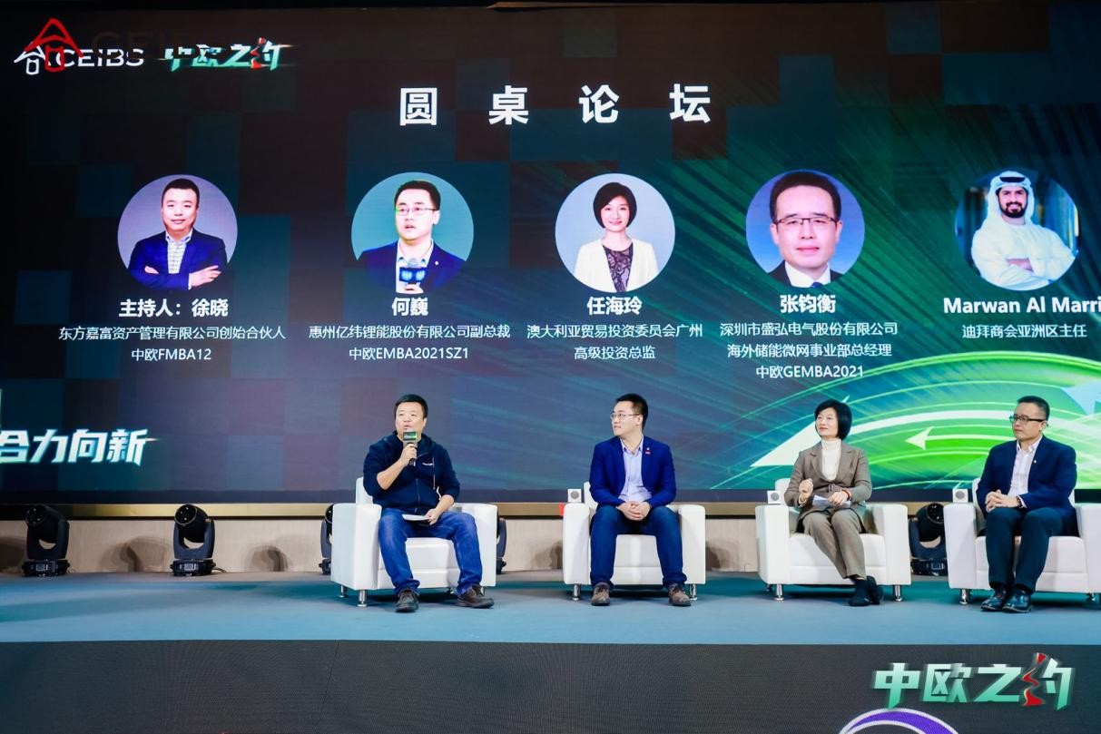 在圆桌对话环节,精英云集,与会嘉宾有来自中欧FMBA12级校友东方嘉富资产创始合伙人徐晓、中欧EMBA2021SZ校友亿纬锂能副总裁何巍、中欧GEMBA2021SMT1校友盛弘电气海外储能微网事业部总经理张钧衡、澳大利亚贸易投资委员会广州高级投资总监任海玲,他们从技术、企业出海、政策、投资、市场等方面输出了各自领域的专业观点,为听众提供了深刻的行业洞察。这些观点不仅拓宽了听众的认知边界,也让他们能够更理性地看待新能源市场的变化和机遇。
