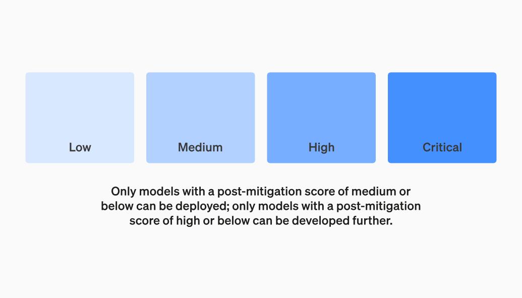 OpenAI 强调,只有在缓解后得分在“中”或以下的模型才能部署,只有缓解后得分在“高”或以下的模型才能进一步开发,并且将针对具有高风险或严重风险(缓解前)风险的模型实施额外的安全措施。