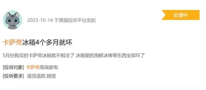 以卡萨帝为例,消费者的投诉内容覆盖有异响、不制冷、多次漏水、压缩机故障、品牌标签混乱、产品信息不符等问题。
