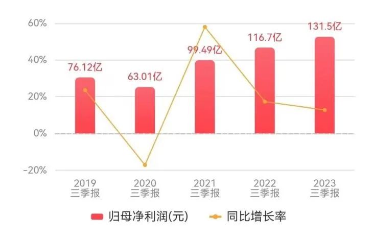 高光之下,隐忧也浮出了水面:2021年前三季度的营业收入同比增长9.86%,净利润同比增长54.90%;2022年前三季度营业收入同比增长8.95%,净利润同比增长17.26%;2023年前三季度营业收入同比增长7.50%,净利润同比增长12.71%。